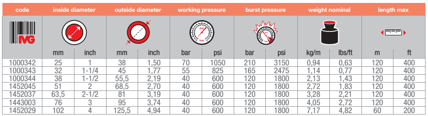 工作压力描述:40bar,55bar,70bar(口径不同压力不同,见下表)。 外胶层及其耐油和耐磨损。适用于恶劣环境。