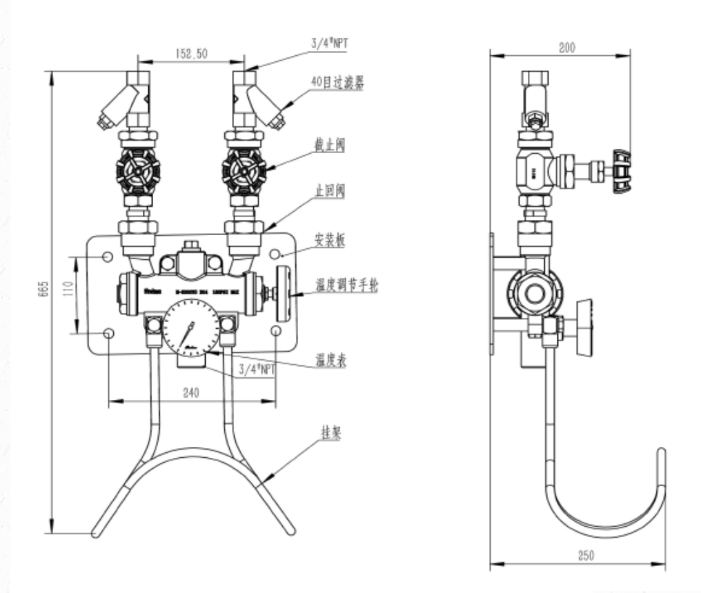 进出口水尺寸:3/4" NPT 混合器:300系列不锈钢材质 止合阀:300系列不锈钢材质 软管挂架:300系列不锈钢材质 温度表:不锈钢(可选)