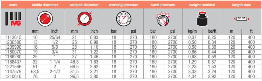 钢丝加强层蒸气管,用于输送最大工作压力为18 bar(260psi)的饱和蒸汽。用于化工,石化以及一般工业应用,EPS/EPP泡沫塑料行业广泛应用。不建议用于蒸汽清洗机。该管可在18bar工作压力时短时间耐230°C的超饱和蒸汽。